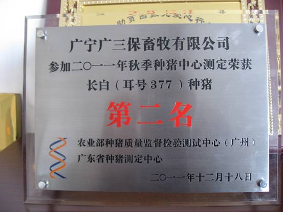 博览会“猪王”——广宁广三保长白公猪377号荣获长白种猪第二名牌匾