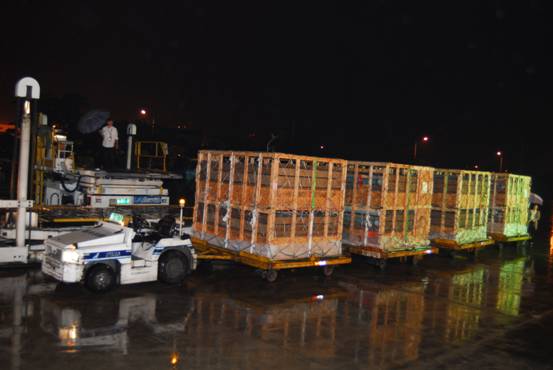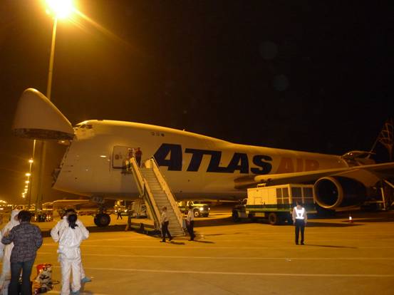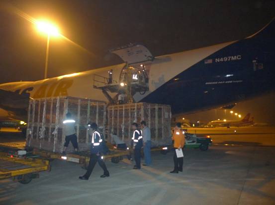 图一 2012年11月23日凌晨0点55分广三保从美国引进的905头种猪包机降落到广州白云国际机场