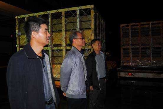 图六 广州出入境检验检疫局领导吴炳荣副局长(左二)、郭光楷处长(左一)现场指导种猪入境检疫工作