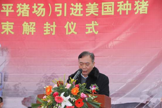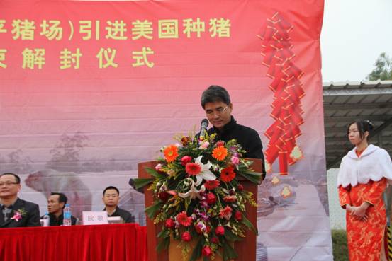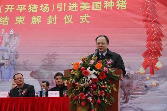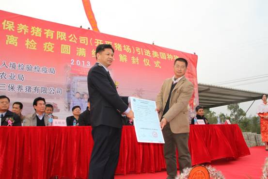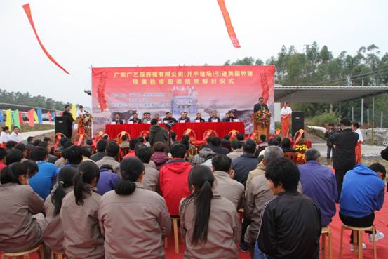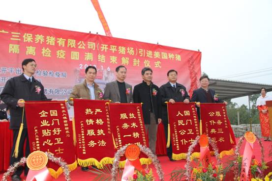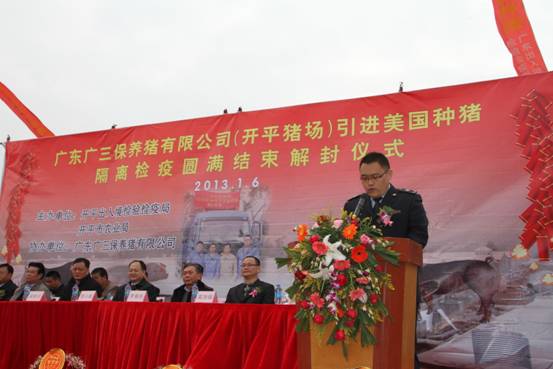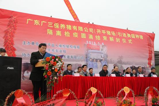 广东广三保养猪有限公司(开平猪场)引进905头美国曾祖代优质种猪隔离检疫圆满结束解封仪式于2013年1月6日在开平猪场隆重举行。本次仪式由开平出入境检验检疫局、开平市农业局主办,广东广三保养猪有限公司协办,出席本次活动的主要嘉宾有:广东出入境检验检疫局陈小帆副局长、广东省畜牧兽医局罗展光副局长、中共开平市委梁和平常委、开平市人民政府莫劲锋副市长、广州出入境检验检疫局吴炳荣副局长、广东出入境检验检疫局动植物检验检疫监管处陈永红处长、广州出入境检验检疫局动物检疫监管处邱金玉副处长、开平出入境检验检疫局刘权叨局长、广东出入境检验检疫局技术中心动检实验室林志雄主任、广东省畜牧技术推广总站吴秋豪站长、广东省畜牧兽医局畜牧处张永发副处长、广州机场出入境检验检疫局刘军民副局长、广州出入境检验检疫局动物隔离检疫场朱广勤场长、开平市农业局张天锡局长、苍城镇梁勇赞常务副镇长、广东省现代农业集团有限公司欧敬总经理。本次仪式由广东省现代农业集团有限公司董事副总经理兼广东广三保养猪有限公司董事长谭德明主持。
