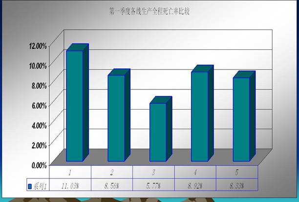 接着,江灵透副总经理以幻灯片的形式将公司第一季度各线生产情况进行了详细的分析。他指出,在全体员工的共同努力下,第一季度(1-13周)各线生产成绩继续稳步提升。第一季度全场产活仔总数为14958头,各阶段共计死亡1266头,其中,哺乳仔猪死亡436头,死亡率为2.91%;保育仔猪死亡433头,死亡率为2.89%;生长育成猪死亡397头,死亡率为2.65%;生产全程死亡率为8.46%。从各线生产成绩对比来看,第一季度生产全程死亡率最高者为11.03%,最低者为5.77%,各线生产业绩基本处于较均衡的状态。按每头折成95公斤计算,第一季度全场总共销售各类活猪14721.56头,占全年上市任务49078头的29.996%;其中,上市各类种猪数量为3019头。三月底全场总存栏猪只32613头,比年初31266头增加了1347头。他指出,第一季度我们在生产上虽然取得了较好的成绩,但是也要看到还存在母猪分娩率有待提高等不足之处,希望大家戒骄戒躁,向行业的强者学习,继续艰苦奋斗,精益求精,全面推进精细化养猪工作,不断提高养猪生产水平。