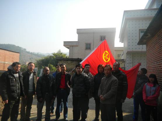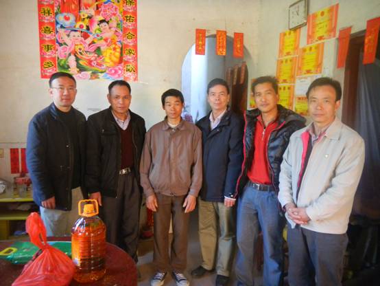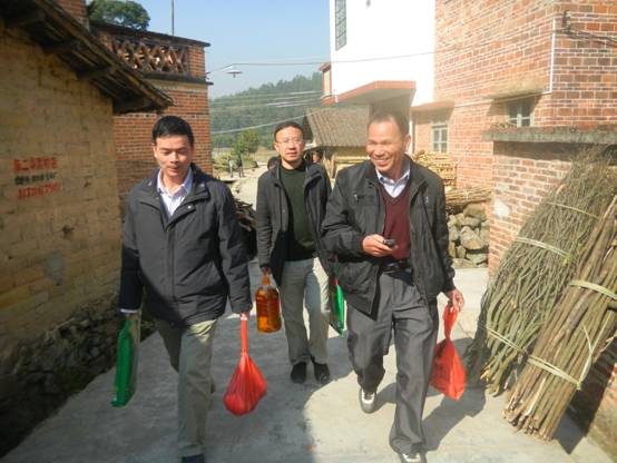 图5:公司管理人员在坑仔口村委党支部书记李金兴(右一)的带领下走访村民