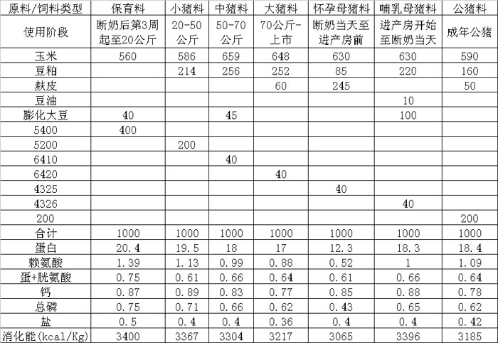 备注:本配方保育料含进口鱼粉3%,小猪料含进口鱼粉1%